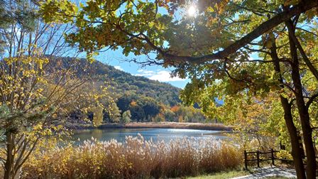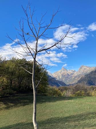 Il bosco misto è ancora vestito dei colori autunnali, caldi contrasti tra le sfumature del giallo, del rosso, dell’ocra e del marrone, inframezzato dagli ultimi ricordi del verde estivo e dagli aghi dei pini. Superato il bivio per Montjovet e Chatillon, sotto gli antichi castagni rinselvatichiti, seguiamo a destra l’indicazione per il “Lago”, abbandonando la mulattiera ormai impraticabile. Il sentiero sale ripido nel bosco, e raggiunge la località La Nache.