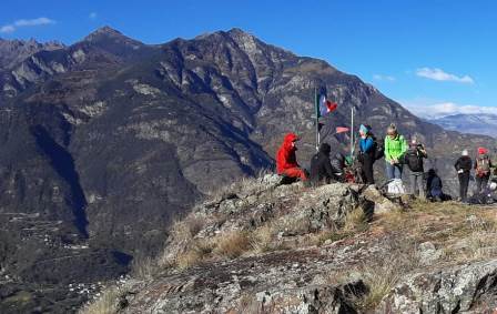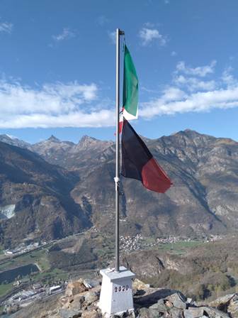 Ancora pochi passi e si raggiunge lo sperone roccioso di vetta a picco sulla valle, con le bandiere, italiana e valdostana, mosse dal vento. Il cielo è azzurro con qualche striatura, il sole splende e il panorama ci ripaga della fatica. Il Monte Avic svetta con la sua elegante silhouette al fondo della Valle di Champdepraz, lo Zerbion incombe sulla Valle Centrale, e le Dame di Challand sulla nascosta Valle d’Ayas.