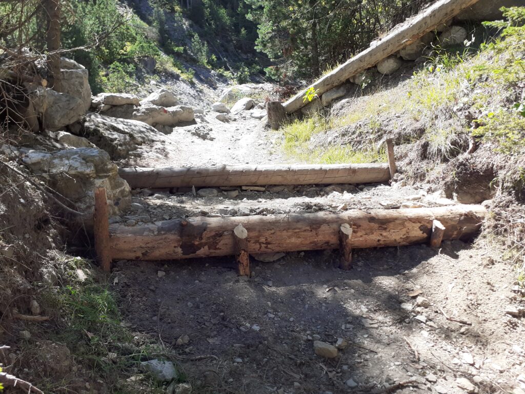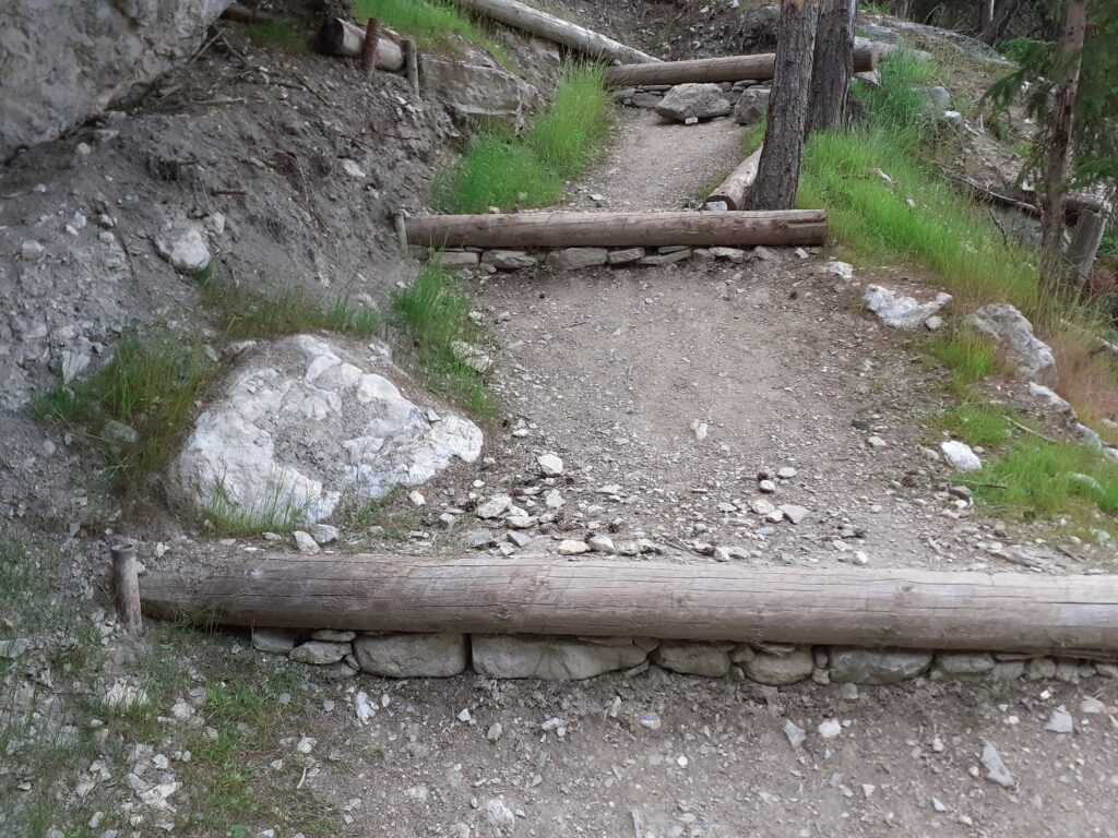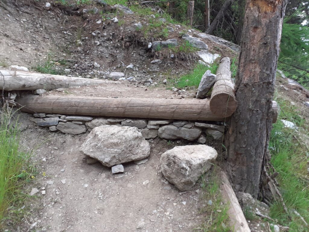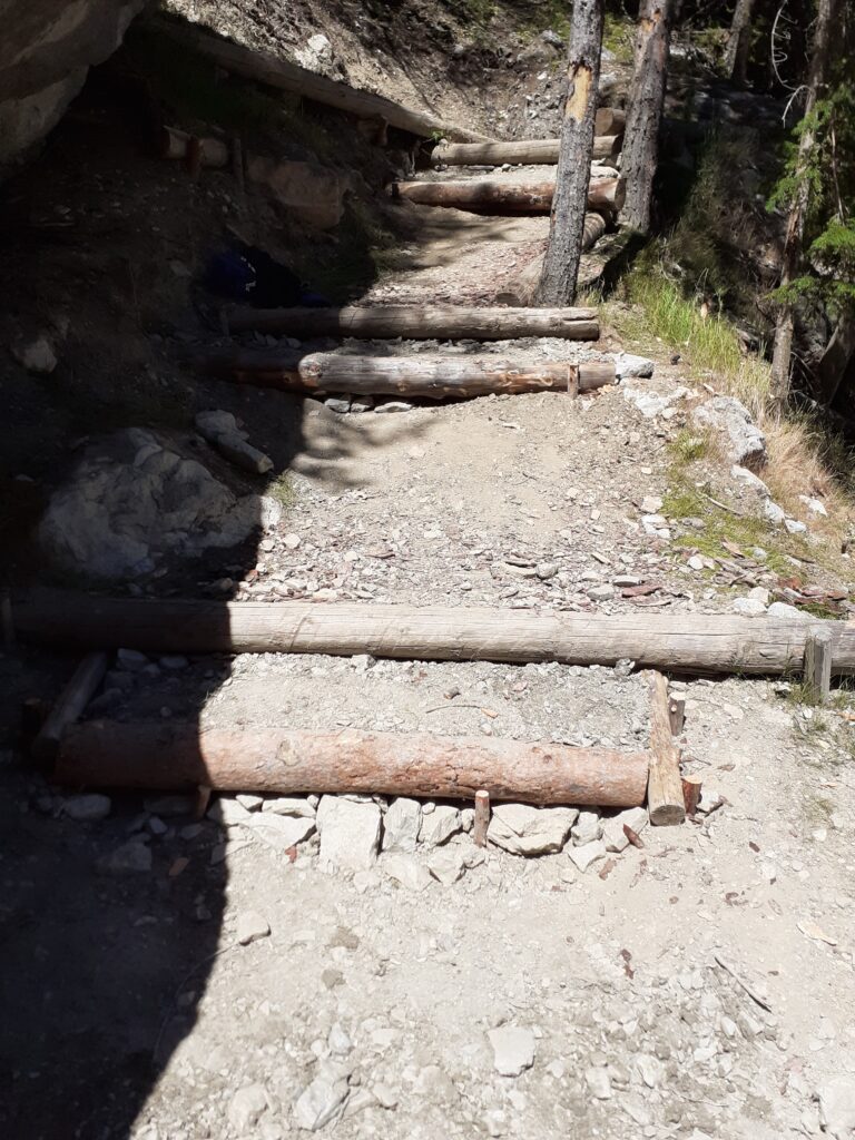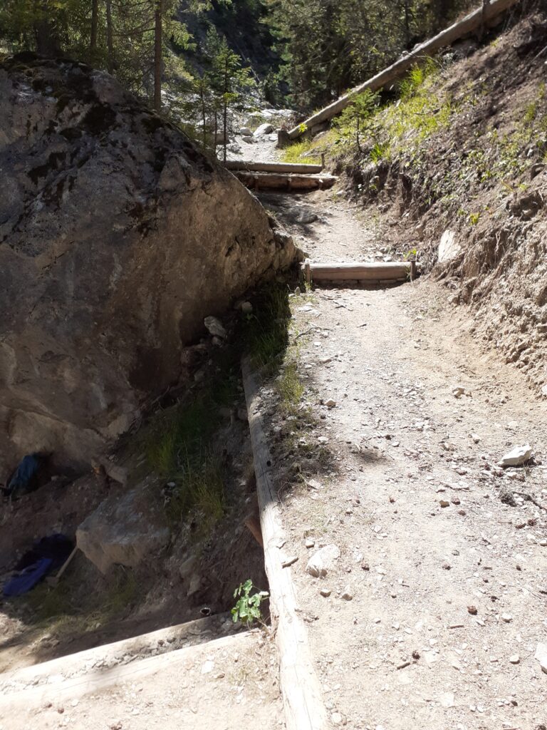 Si è trattato di spalare un po’ di terra e costruire due- tre, gradini di legno pietra e terra in modo da ridurre le alzate dei gradoni esistenti (vedi foto).
