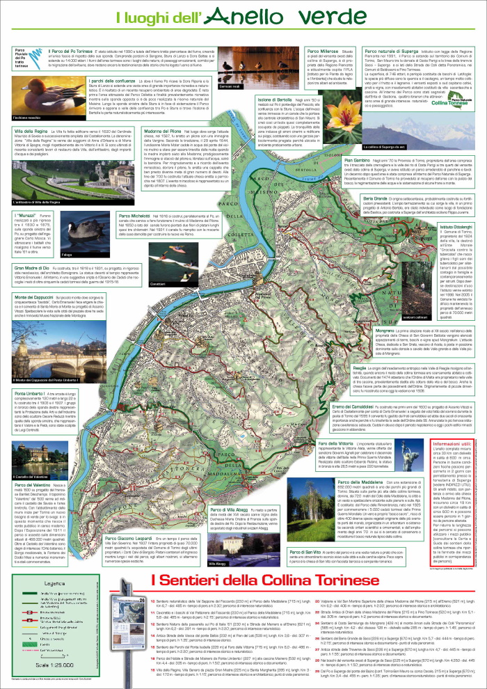 Il percorso pedonale denominato “Anello Verde” è un percorso unico, circolare, realizzato quasi interamente all’interno dei confini comunali di Torino, che si snoda all’interno di parchi, aree di elevato valore naturalistico ed emergenze storico-ambientali, sentieri già tracciati da tempo e sentieri nuovi realizzati e attrezzati più di recente. Partendo dalle sponde del Po, in zona Parco del Valentino – ponte Isabella, raggiunge il Parco della Maddalena, attraverso i Parchi Leopardi e San Vito, collegandosi poi a Superga, passando per Reaglie, Mongreno, Istituto Ottolenghi, Beria Grande, per poi ridiscendere al Po e al Parco del Meisino, attraverso Pian Gambino e Parco Millerose.
