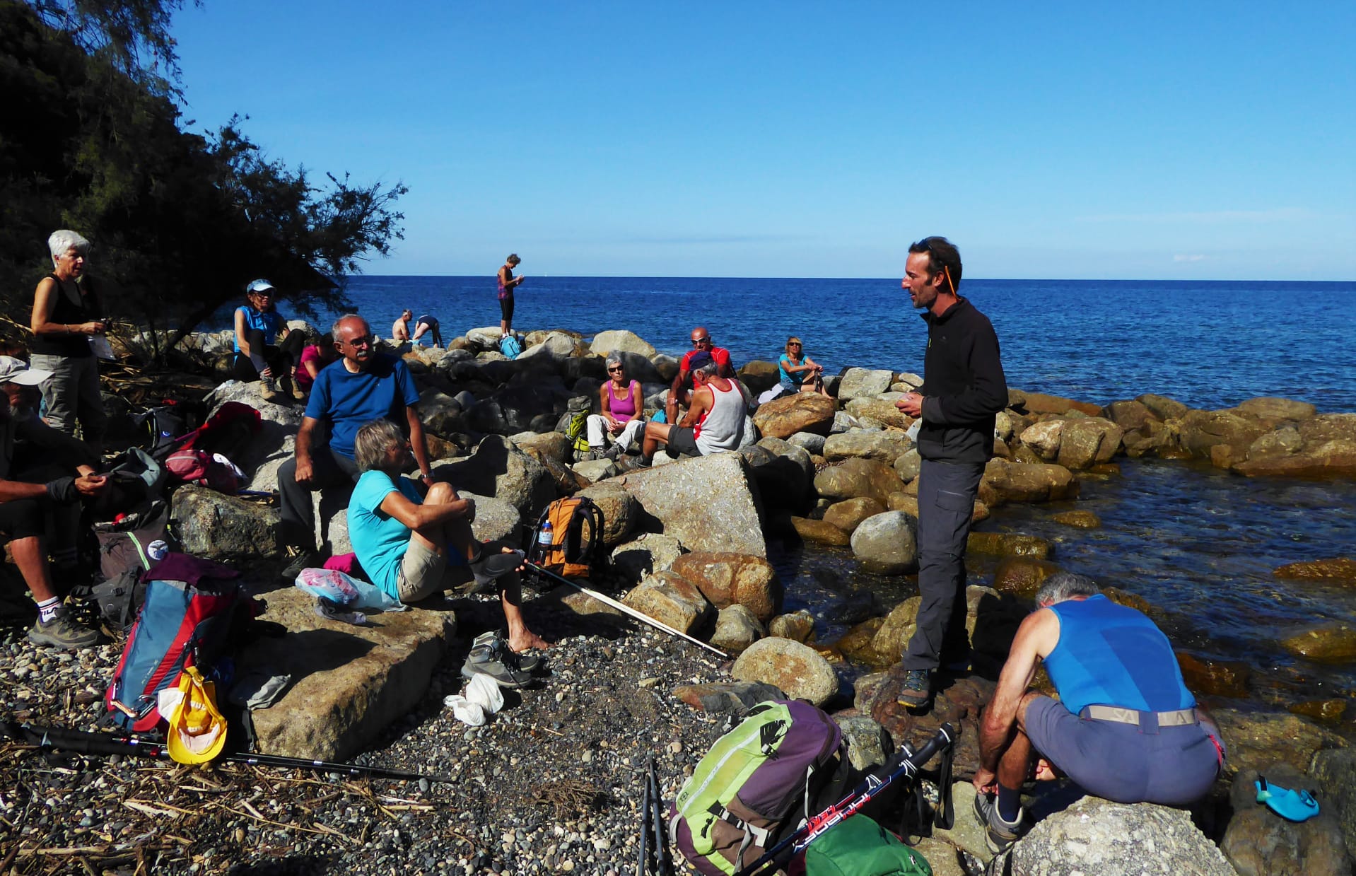 Incontriamo la guida escursionistica che ci accompagnerà durante la settimana, Patrizio, che con il collega Alessandro che ci raggiungerà giovedì, ci introduce alla conoscenza dell’isola. La cooperativa Pélagos con la quale ambedue collaborano svolge importanti attività di monitoraggio ambientale e di ricerca in appoggio ad Università e organismi per la tutela dell’ambiente e del mare, oltre ad una considerevole attività didattica con le scuole.  Forse è proprio la consuetudine alla comunicazione con bambini e ragazzi che rende la loro spiegazione, competente e appassionata, anche molto fresca, spontanea e ricca di fantasia, nel sonante accento elbano che è un piacere ascoltare.